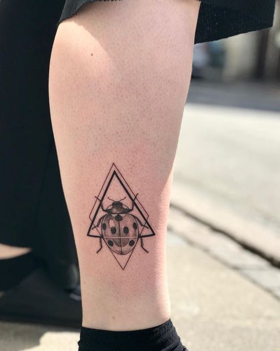 Il tatuaggio con la coccinella in stile geometrico utilizza forme geometriche, come triangoli, cerchi e linee, per creare un disegno astratto che richiama la forma della coccinella.