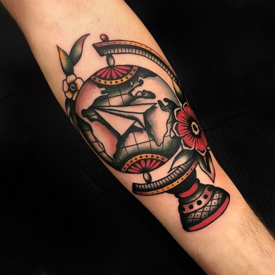 Un elemento iconico che spesso accompagna i tatuaggi con il mondo è l’aereo che vola sulla mappa. Questa immagine simbolizza il desiderio di esplorare, la passione per i viaggi e la libertà di attraversare confini geografici.